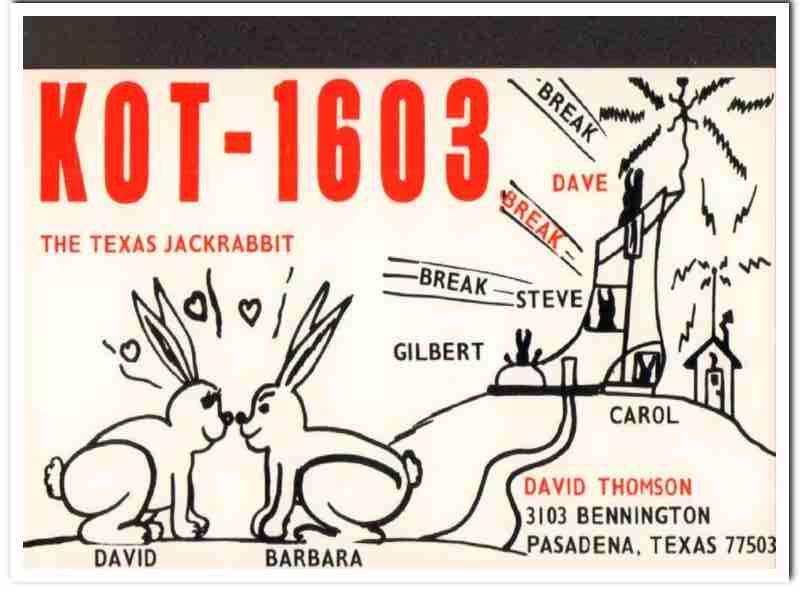 Original QSL postcard from the mid to late 1960s.This card was sent from CB radio station: KOT-1603. Was issued to Barbara and David Thomson, at 3103 Bennington Drive, Pasadena, Texas. Chicldren names are Steve, Gilbert and Carol Thomson. His CB handle was The Texas Jackrabbit. During the 1920s and 1930s, amateur ham radio operators adopted the practice of two-way exchanging of QSL postcards, to confirm their radio contact, with a report of reception. QSL cards got to be known as wallpaper, commonly used to decorate the walls of their radio equipment room. During the 1960s, CB citizen band radio became popular, and the practice of exchanging QSL cards to confirm radio contacts was enjoyed by many with this new hobby. Today, these cards are very collectible and look great matted and framed.