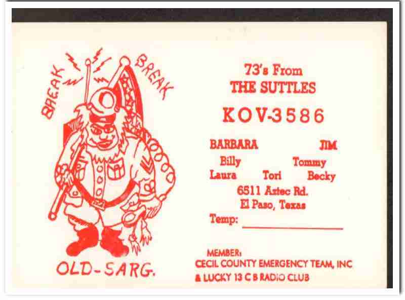 Original QSL postcard from the mid to late 1960s.This unused card was sent from CB radio station: KOV-3586. Was issued to Barbara and Jim Suttle, at 6511 Aztec Road, El Paso, Texas. Children names are Billy, Tommy, Laura, Tori, and Becky Suttle. His CB handle was Old Sarg. Red text. During the 1920s and 1930s, amateur ham radio operators adopted the practice of two-way exchanging of QSL postcards, to confirm their radio contact, with a report of reception. QSL cards got to be known as wallpaper, commonly used to decorate the walls of their radio equipment room. During the 1960s, CB citizen band radio became popular, and the practice of exchanging QSL cards to confirm radio contacts was enjoyed by many with this new hobby. Today, these cards are very collectible and look great matted and framed.