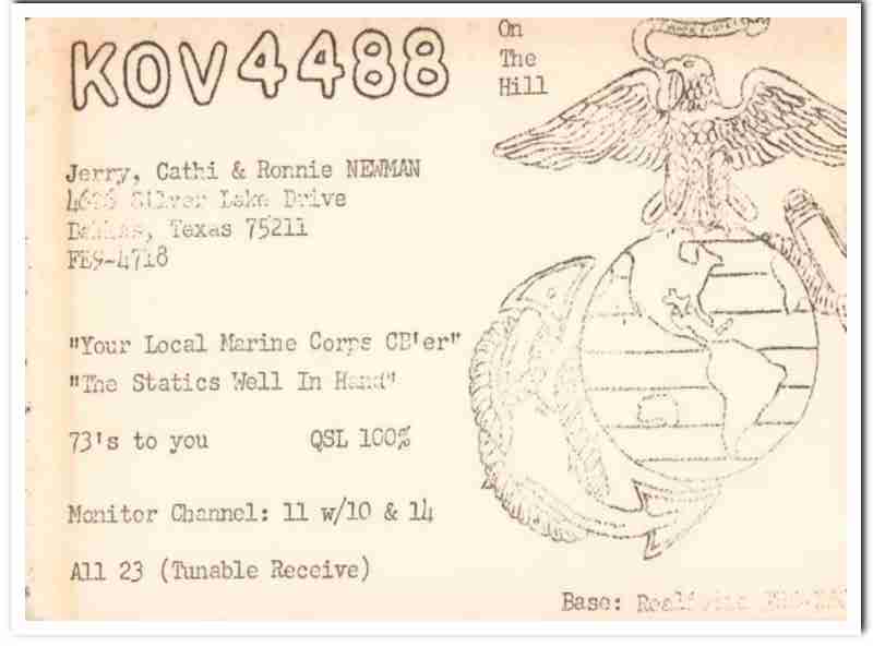 Original QSL postcard from the mid to late 1960s.This unused card was sent from CB radio station: KOV-4488. Was issued to Cathi and Jerry Newman, at 4626 Silver Lake Drive, Dallas, Texas. On The Hill. You Local Marine Corps CBer. Child name is Ronnie Newman. During the 1920s and 1930s, amateur ham radio operators adopted the practice of two-way exchanging of QSL postcards, to confirm their radio contact, with a report of reception. QSL cards got to be known as wallpaper, commonly used to decorate the walls of their radio equipment room. During the 1960s, CB citizen band radio became popular, and the practice of exchanging QSL cards to confirm radio contacts was enjoyed by many with this new hobby. Today, these cards are very collectible and look great matted and framed.