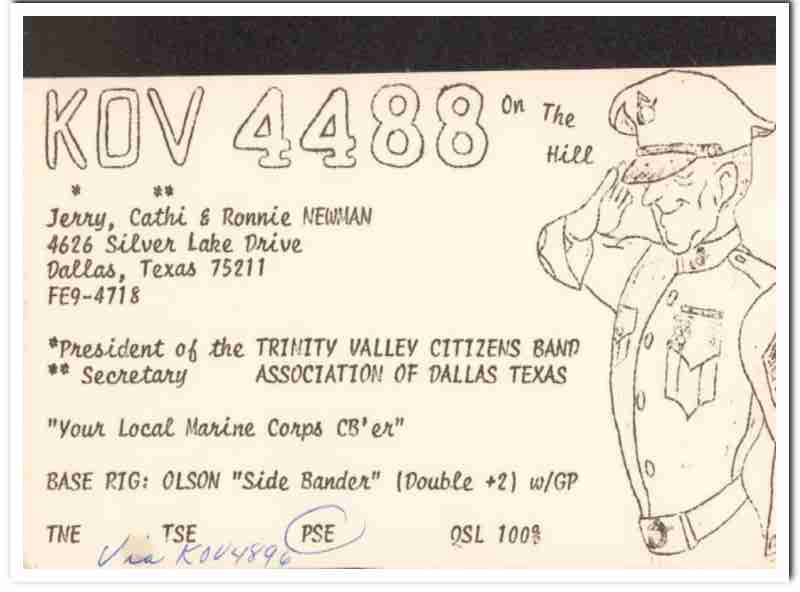 Original QSL postcard from the mid to late 1960s.This unused card was sent from CB radio station: KOV-4488. Was issued to Cathi and Jerry Newman, at 4626 Silver Lake Drive, Dallas, Texas. On The Hill. President of the Trinity Valley Citizens Band Association of Dallas Texas. Your local Marine Corps CBer. Child name is Ronnie Newman. During the 1920s and 1930s, amateur ham radio operators adopted the practice of two-way exchanging of QSL postcards, to confirm their radio contact, with a report of reception. QSL cards got to be known as wallpaper, commonly used to decorate the walls of their radio equipment room. During the 1960s, CB citizen band radio became popular, and the practice of exchanging QSL cards to confirm radio contacts was enjoyed by many with this new hobby. Today, these cards are very collectible and look great matted and framed.