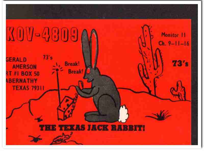 Original QSL postcard from the mid to late 1960s.This unused card was sent from CB radio station: KOV-4809. Was issued to Gerald Amerson, at Route 1, Abernathy, Texas.His CB handle was The Texas Jack Rabbit. Red card. During the 1920s and 1930s, amateur ham radio operators adopted the practice of two-way exchanging of QSL postcards, to confirm their radio contact, with a report of reception. QSL cards got to be known as wallpaper, commonly used to decorate the walls of their radio equipment room. During the 1960s, CB citizen band radio became popular, and the practice of exchanging QSL cards to confirm radio contacts was enjoyed by many with this new hobby. Today, these cards are very collectible and look great matted and framed.