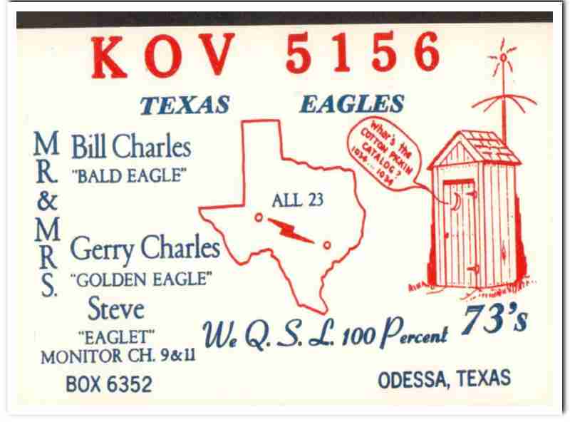 Original QSL postcard from the mid to late 1960s.This unused card was sent from CB radio station: KOV-5156. Was issued to Gerry and Bill Charles, of Odessa, Texas. His CB handle was Bald Eagle. Her CB handle was Golden Eagle. Child name is Steve, CB handle was Eaglet. Known as The Texas Eagles. During the 1920s and 1930s, amateur ham radio operators adopted the practice of two-way exchanging of QSL postcards, to confirm their radio contact, with a report of reception. QSL cards got to be known as wallpaper, commonly used to decorate the walls of their radio equipment room. During the 1960s, CB citizen band radio became popular, and the practice of exchanging QSL cards to confirm radio contacts was enjoyed by many with this new hobby. Today, these cards are very collectible and look great matted and framed.