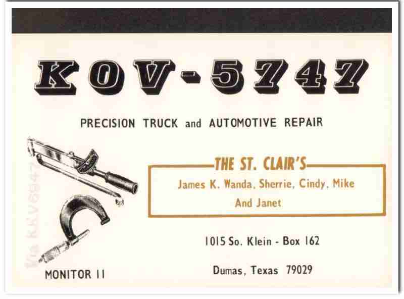 Original QSL postcard from the mid to late 1960s.This unused card was sent from CB radio station: KOV-5747. Was issued to Wanda and James K. St. Clair, at 1015 South Klein Avenue, Dumas, Texas. Children names are Sherrie, Cindy, Mike and Janet St. Clair. Precision Truck and Automotive Repair. The St. Clairs. During the 1920s and 1930s, amateur ham radio operators adopted the practice of two-way exchanging of QSL postcards, to confirm their radio contact, with a report of reception. QSL cards got to be known as wallpaper, commonly used to decorate the walls of their radio equipment room. During the 1960s, CB citizen band radio became popular, and the practice of exchanging QSL cards to confirm radio contacts was enjoyed by many with this new hobby. Today, these cards are very collectible and look great matted and framed.