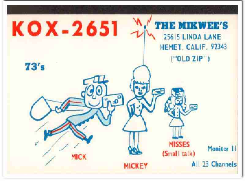 Original QSL postcard from the mid to late 1960s.This unused card was sent from CB radio station: KOX-2651. Was issued to Mickey and Mick Mikwee, at 25615 Linda Lane, Hemet, California. His CB handle was Old Zip, might have been a postal carrier. During the 1920s and 1930s, amateur ham radio operators adopted the practice of two-way exchanging of QSL postcards, to confirm their radio contact, with a report of reception. QSL cards got to be known as wallpaper, commonly used to decorate the walls of their radio equipment room. During the 1960s, CB citizen band radio became popular, and the practice of exchanging QSL cards to confirm radio contacts was enjoyed by many with this new hobby. Today, these cards are very collectible and look great matted and framed.