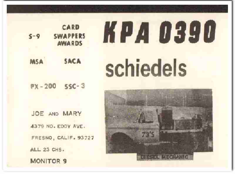 Original QSL postcard from the mid to late 1960s.This unused card was sent from CB radio station: KPA-0390. Was issued to MAry and Joe Schiedel, at 4379 North Eddy Avenue, Fresno, California. Diesel Mechanic. During the 1920s and 1930s, amateur ham radio operators adopted the practice of two-way exchanging of QSL postcards, to confirm their radio contact, with a report of reception. QSL cards got to be known as wallpaper, commonly used to decorate the walls of their radio equipment room. During the 1960s, CB citizen band radio became popular, and the practice of exchanging QSL cards to confirm radio contacts was enjoyed by many with this new hobby. Today, these cards are very collectible and look great matted and framed.