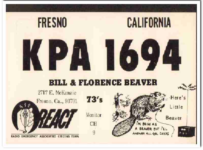Original QSL postcard from the mid to late 1960s.This unused card was sent from CB radio station: KPA-1694. Was issued to Florence and Bill Beaver, at 2717 East McKenzie Avenue, Fresno, California. Was a member of REACT. His CB handle was Little Beaver. Card is white with black text. During the 1920s and 1930s, amateur ham radio operators adopted the practice of two-way exchanging of QSL postcards, to confirm their radio contact, with a report of reception. QSL cards got to be known as wallpaper, commonly used to decorate the walls of their radio equipment room. During the 1960s, CB citizen band radio became popular, and the practice of exchanging QSL cards to confirm radio contacts was enjoyed by many with this new hobby. Today, these cards are very collectible and look great matted and framed.