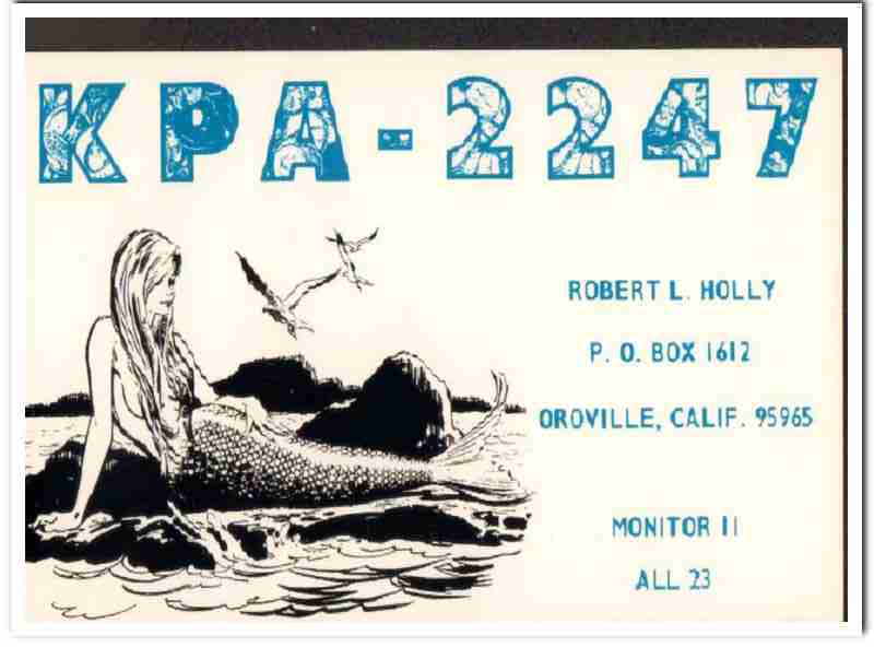 Original QSL postcard from the mid to late 1960s.This unused card was sent from CB radio station: KPA-2247. Was issued to Robert L. Holly, of Oroville, California. Card is white with blue text. Has an image of an mermaid. During the 1920s and 1930s, amateur ham radio operators adopted the practice of two-way exchanging of QSL postcards, to confirm their radio contact, with a report of reception. QSL cards got to be known as wallpaper, commonly used to decorate the walls of their radio equipment room. During the 1960s, CB citizen band radio became popular, and the practice of exchanging QSL cards to confirm radio contacts was enjoyed by many with this new hobby. Today, these cards are very collectible and look great matted and framed.