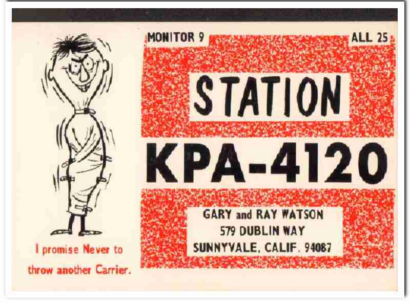 Original QSL postcard from the mid to late 1960s.This unused card was sent from CB radio station: KPA-4120. Was issued to Ray and Gary Watson, at 579 Dublin Way, Sunnyvale, California. I Promise Never To Throw Another Carrier. Card is white and red with black text. During the 1920s and 1930s, amateur ham radio operators adopted the practice of two-way exchanging of QSL postcards, to confirm their radio contact, with a report of reception. QSL cards got to be known as wallpaper, commonly used to decorate the walls of their radio equipment room. During the 1960s, CB citizen band radio became popular, and the practice of exchanging QSL cards to confirm radio contacts was enjoyed by many with this new hobby. Today, these cards are very collectible and look great matted and framed.