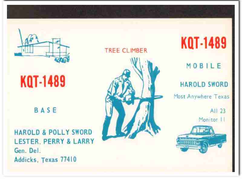 Original QSL postcard from the mid to late 1960s.This unused card was sent from CB radio station: KQT-1489. Was issued to Polly and Harold Sword, of Addicks, Texas. His CB handle was the Tree Climber. Children names are Lester, Perry and Larry Sword. Base and Mobile. During the 1920s and 1930s, amateur ham radio operators adopted the practice of two-way exchanging of QSL postcards, to confirm their radio contact, with a report of reception. QSL cards got to be known as wallpaper, commonly used to decorate the walls of their radio equipment room. During the 1960s, CB citizen band radio became popular, and the practice of exchanging QSL cards to confirm radio contacts was enjoyed by many with this new hobby. Today, these cards are very collectible and look great matted and framed.