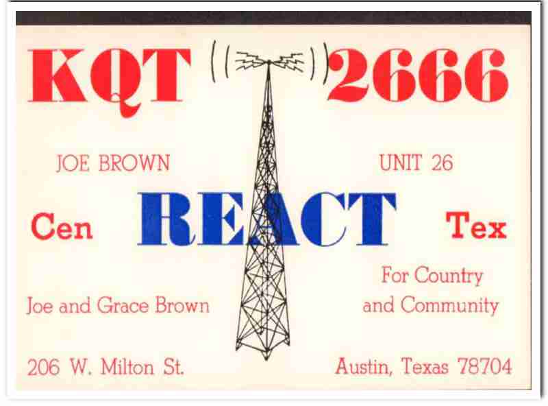 Original QSL postcard from the mid to late 1960s.This unused card was sent from CB radio station: KQT-2666. Was issued to Grace and Joe Brown, at 206 West Milton Stret, Austin, Texas. Cen REACT Tex. For Country and Community. During the 1920s and 1930s, amateur ham radio operators adopted the practice of two-way exchanging of QSL postcards, to confirm their radio contact, with a report of reception. QSL cards got to be known as wallpaper, commonly used to decorate the walls of their radio equipment room. During the 1960s, CB citizen band radio became popular, and the practice of exchanging QSL cards to confirm radio contacts was enjoyed by many with this new hobby. Today, these cards are very collectible and look great matted and framed.