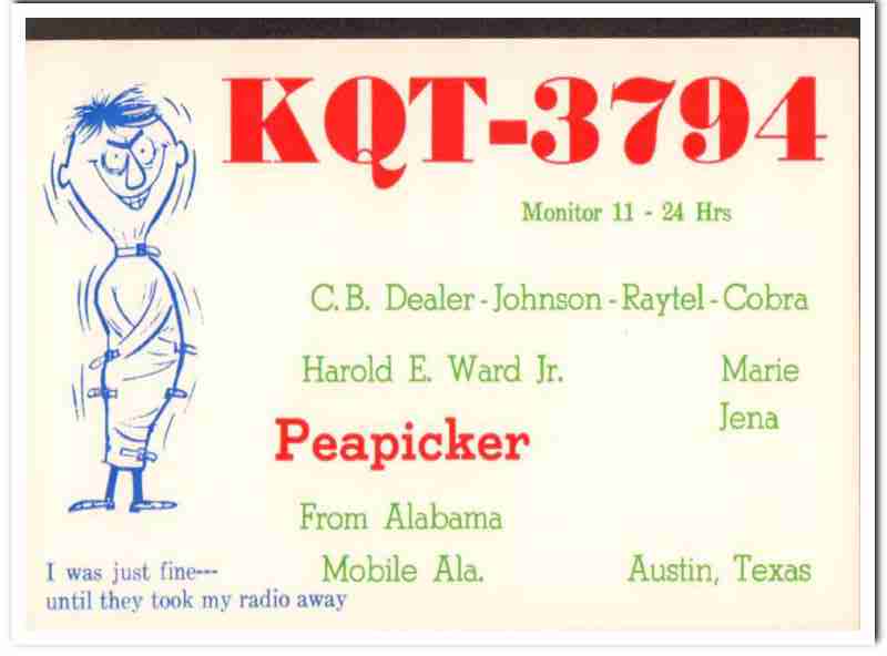 Original QSL postcard from the mid to late 1960s.This unused card was sent from CB radio station: KQT-3794. Was issued to Marie and Harold E. Ward Jr., of Mobile, Alabama and Austin, Texas. His CB handle was Peapicker. Child name is Jena. During the 1920s and 1930s, amateur ham radio operators adopted the practice of two-way exchanging of QSL postcards, to confirm their radio contact, with a report of reception. QSL cards got to be known as wallpaper, commonly used to decorate the walls of their radio equipment room. During the 1960s, CB citizen band radio became popular, and the practice of exchanging QSL cards to confirm radio contacts was enjoyed by many with this new hobby. Today, these cards are very collectible and look great matted and framed.
