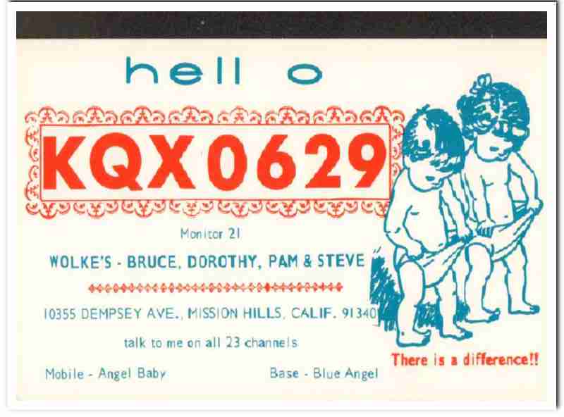 Original QSL postcard from the mid to late 1960s.This unused card was sent from CB radio station: KQX-0629. Was issued to Dorothy and Bruce Wolke, at 10355 Dempsey Avenue, Mission Hills, California. Children names are Pam and Steve Wolke. Base handle was Blue angle and mobile handle was Angle Baby. Card is white with blue and red text. During the 1920s and 1930s, amateur ham radio operators adopted the practice of two-way exchanging of QSL postcards, to confirm their radio contact, with a report of reception. QSL cards got to be known as wallpaper, commonly used to decorate the walls of their radio equipment room. During the 1960s, CB citizen band radio became popular, and the practice of exchanging QSL cards to confirm radio contacts was enjoyed by many with this new hobby. Today, these cards are very collectible and look great matted and framed.