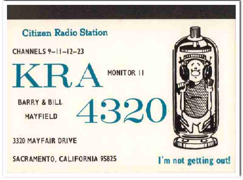 Original QSL postcard from the mid to late 1960s.This unused card was sent from CB radio station: KRA-4320. Was issued to Barry and Bill Mayfield, at 3320 Mayfield Drive, Sacramento, California. Card is white with black and blue text. Has an image of a vacuum tube with a radio operator inside, and caption below is Im Not Getting Out! During the 1920s and 1930s, amateur ham radio operators adopted the practice of two-way exchanging of QSL postcards, to confirm their radio contact, with a report of reception. QSL cards got to be known as wallpaper, commonly used to decorate the walls of their radio equipment room. During the 1960s, CB citizen band radio became popular, and the practice of exchanging QSL cards to confirm radio contacts was enjoyed by many with this new hobby. Today, these cards are very collectible and look great matted and framed.