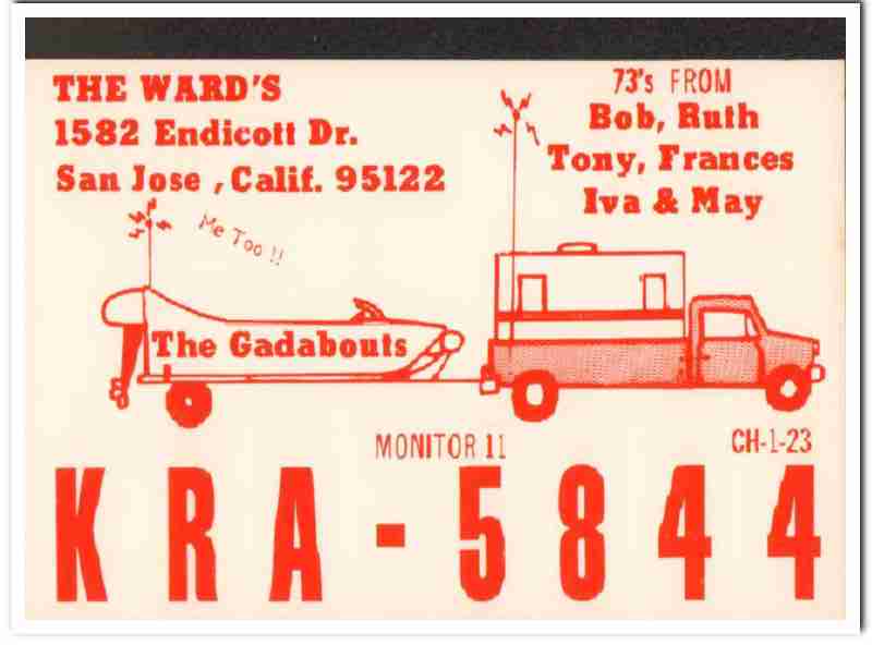 Original QSL postcard from the mid to late 1960s.This unused card was sent from CB radio station: KRA-5844. Was issued to Ruth and Bob Ward, at 1582 Endicott Drive, San Jose, California. Children names are Tony, Frances, Iva and May Ward. Base, mobile and marine units. Boat name is The Gadabouts. During the 1920s and 1930s, amateur ham radio operators adopted the practice of two-way exchanging of QSL postcards, to confirm their radio contact, with a report of reception. QSL cards got to be known as wallpaper, commonly used to decorate the walls of their radio equipment room. During the 1960s, CB citizen band radio became popular, and the practice of exchanging QSL cards to confirm radio contacts was enjoyed by many with this new hobby. Today, these cards are very collectible and look great matted and framed.