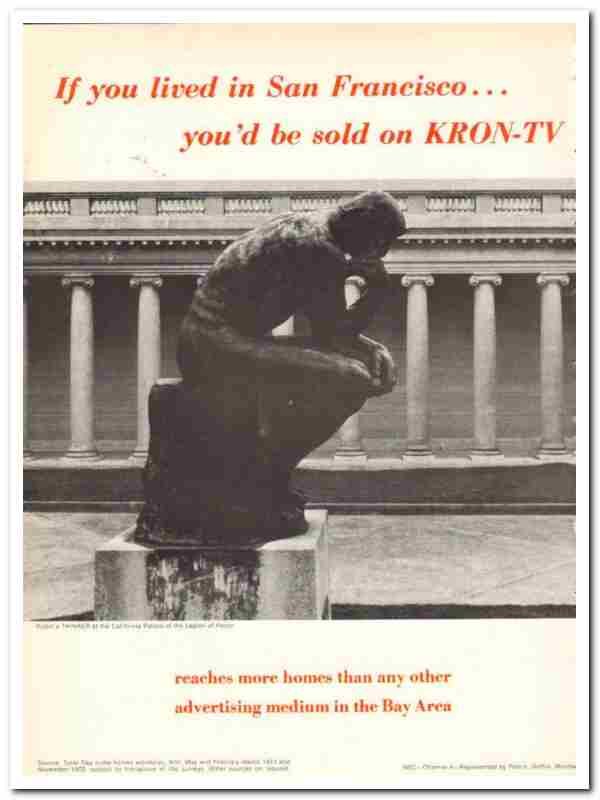 Original media vintage magazine ad for KRON-TV. Rodin's Thinker at the California Palace of the Legion of Honor. If you lived in San Francisco you'd be sold. Reaches more homes than any other advertising medium in the Bay Area. NBC Channel 4 represented by Peters, Griffin, Woodward.
