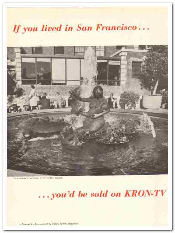 Original media vintage magazine ad for KRON-TV. Ruth Asawa's Andrea fountain in Ghirardelli Square. If you lived in San Francisco You'd be sold on Channel 4. Represented by Peters, griffin, Woodward.