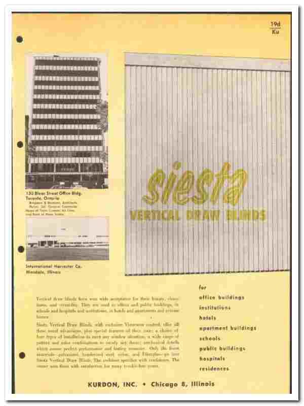 Siesta Vertical Draw Blinds, with exclusive Vistarama control, offer all the usual advantages, plus special features of their own; a choice of four types of installation to meet any window situation; a wide range of patterns and color combinations to satisfy any decor; mechanical details which assure perfect performance and lasting economy. Only the finest materials; galvanized, bonderized steel, nylon and Fiberglas - go into Siesta Vertical Draw Blinds. The architect specifies with confidence. The owner uses them with satisfaction for many trouble for years.