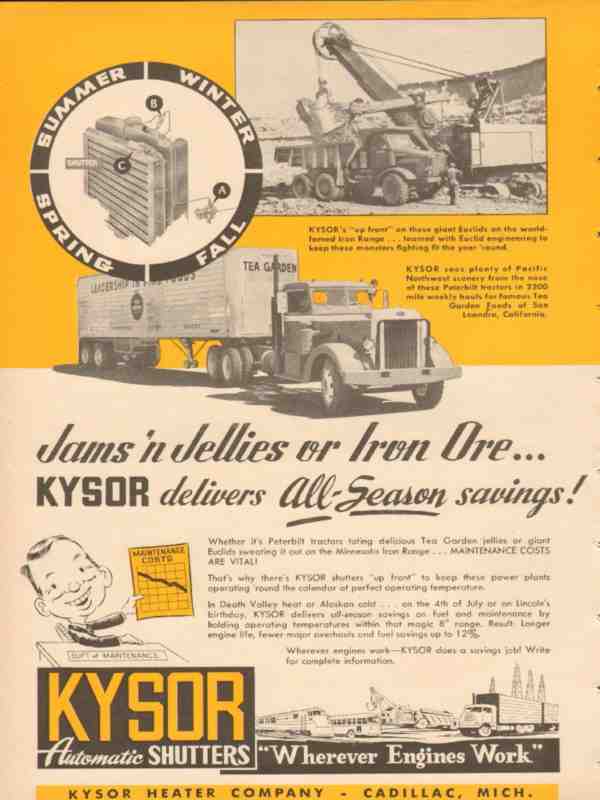 Original old truck engines industry trade magazine vintage ad for KYSOR HEATER COMPANY of Cadillac, MI. Jam and Jellies or Iron Ore. Kysor Delivers All Season Savings! Kysor sees plenty of Pacific Northwest scenery from the nose of Peterbilt tractors in hauls for famous Tea Garden Foods of San Leandro, California. Kysor Automatic Shutters. This 1953 trucking magazine advertisement would display beautifully matted and framed.