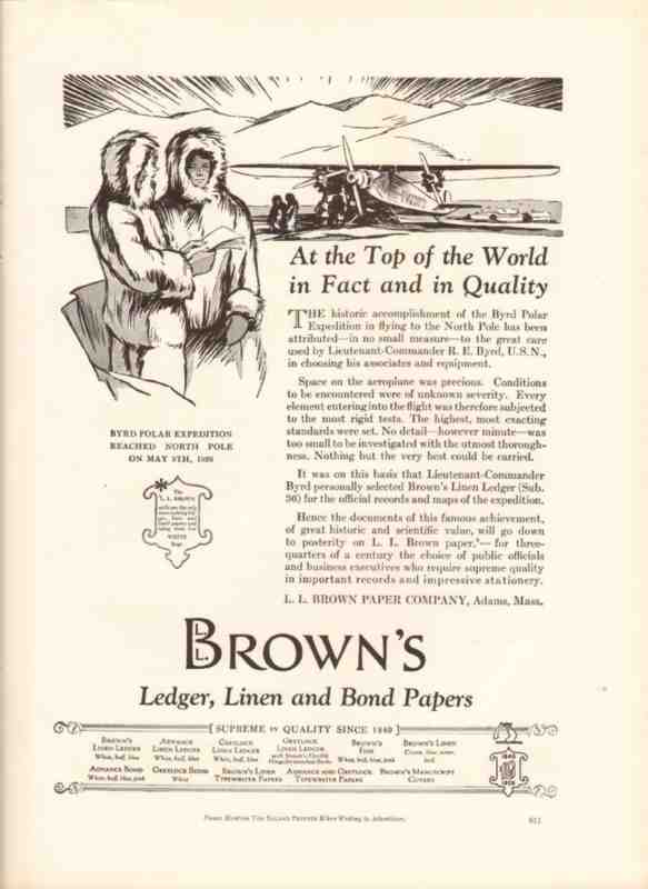 Original old magazine printing vintage ad for L.L. BROWN PAPER COMPANY in Adams, MA. Byrd Polar Expedition used Brown's Linen Ledger for the official records and maps of his expedition. At the top of the world in fact and quality. This 1926 unique one page print industry trade advertisement would display beautifully matted and framed.
