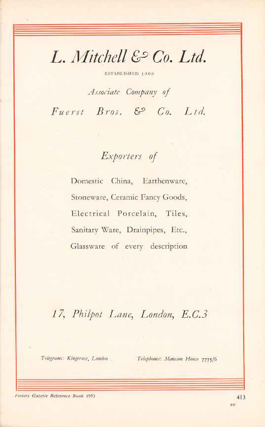 Original pottery vintage ad for L. MITCHELL COMPANY, LTD. Fuerst Bros. and Company, exporters of domestic china, earthenware, stoneware, ceramic fancy goods, electrical porcelain, tiles, sanitary ware, drainpipes, glassware of every description.