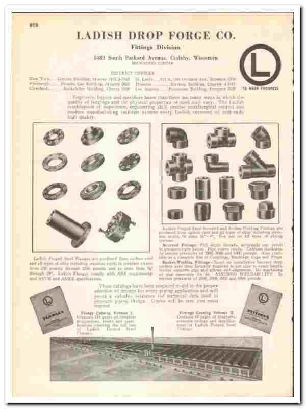 Original 1945 industrial trade vintage catalog for the LADISH DROP FORGE COMPANY. (Fittings Division). Main office and plant were located at 5481 South Packard Avenue, Cudahy, WI.