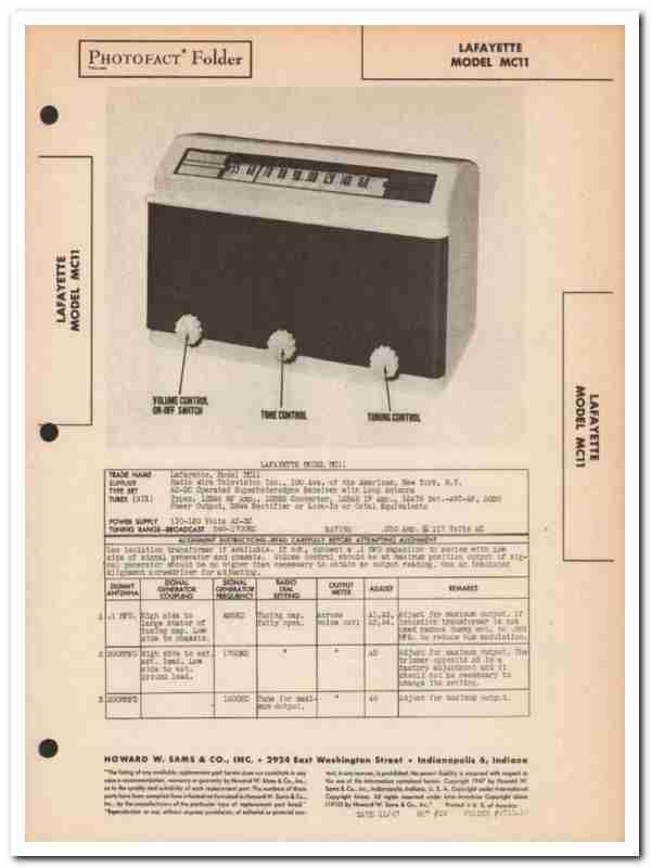 Vintage Radio Service Manual - LAFAYETTE model MC11 6-tube Superheterodyne AM radio receiver. Manufactured by Radio Wire & Television Inc., of New York, NY. Dated 1947. 3 pages. Original old Sams Photofact manual includes schematic, layout, alignment instructions, voltage & resistance test chart, repair parts list and description. This manual would make a sensational accompaniment to your retro audio equipment.