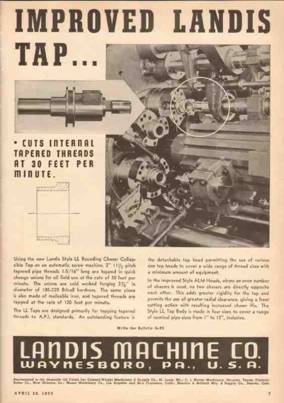 Original oil and gas trade magazine vintage ad for THE LANDIS MACHINE COMPANY of Waynesboro, PA. Improved tap, Style LL Receding Chaser. Designed for tapping tapered threads to API standards. This unique 1950 old industrial equipment magazine advertisement would display beautifully matted and framed. Nice graphics.