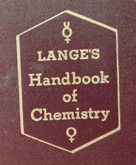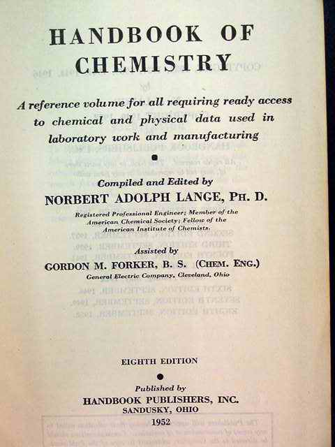 Soft covered book titled HANDBOOK OF CHEMISTRY, A Reference Volume for All Requiring Ready Access to Chemical and Physical Data used in Laboratory Work and Manufacturing. Compiled and Edited by Norbert Adolph Lange, Ph.D., 1952, Eight Edition. 1998 pages.