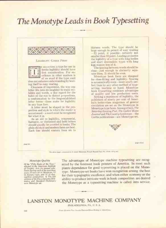 Original old printing magazine vintage ad for LANSTON MONOTYPE MACHINE COMPANY in Philadelphia, PA. Leading in book typesetting. Legibility comes first. Designed for close-fitting and legibility. Spacing is automatically even. Fine magazines including the Saturday Evening Post, Ladies Home Journal and the Country Gentleman all use Monotype set.