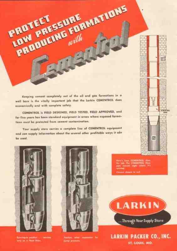 Original oil and gas trade magazine vintage ad for LARKIN PACKER COMPANY, INC of St. Louis, MO. Cementrol Protects Low Pressure Producing Formations. Field designed, tested, and approved. This unique 1950 old oilfield petroleum well drilling industry magazine advertisement would display beautifully matted and framed. Nice graphics.