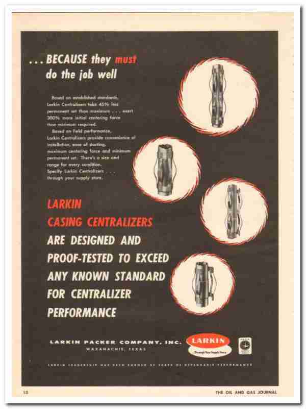 Original oil and gas trade magazine vintage ad for LARKIN PACKER COMPANY, INC of Waxahachie, TX. Must do the job well. Casing Centralizers designed and proof-tested to exceed any know standard for performance. Provides convenience of installation, ease of starting, maximum centering force, minimum permanent set. This unique 1959 old oilfield petroleum drilling industry equipment magazine advertisement would display beautifully matted and framed. Nice graphics.