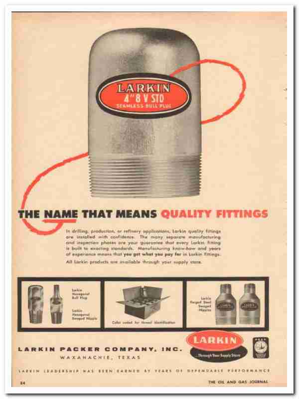 Original oil and gas trade magazine vintage ad for LARKIN PACKER COMPANY. INC. of Waxahachie, TX. Name Means Quality Fittings. In drilling, production, or refinery applications, Larkin fittings are installed with confidence. This unique 1959 old oilfield petroleum well industry magazine advertisement would display beautifully matted and framed.