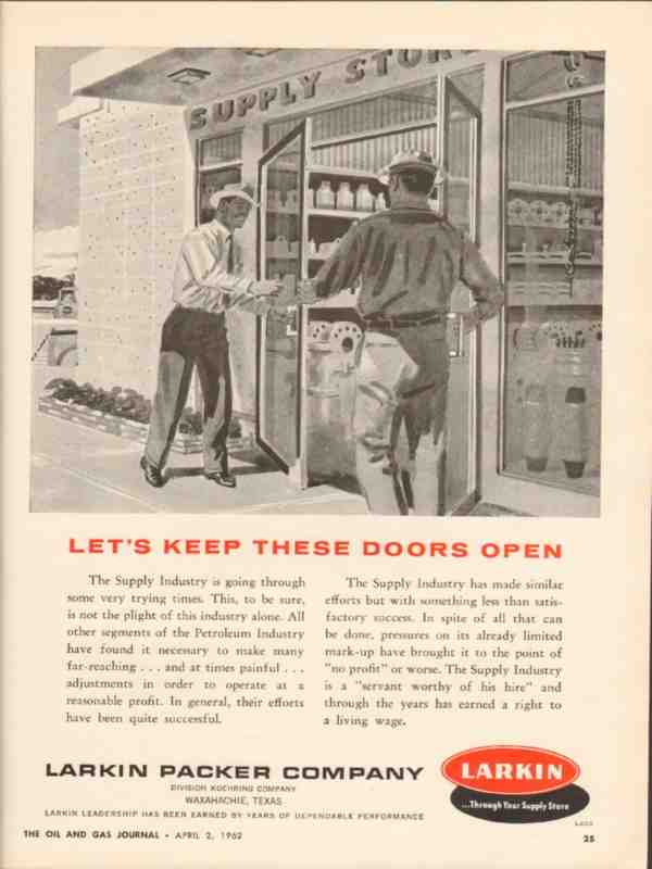 Original oil and gas trade magazine vintage ad for LARKIN PACKER COMPANY of Waxahachie, TX. Let's Keep These Doors Open. The Supply Industry is going through some very trying times. Division Koehring Company. This unique 1962 old oilfield petroleum industry tools and equipment magazine advertisement would display beautifully matted and framed.