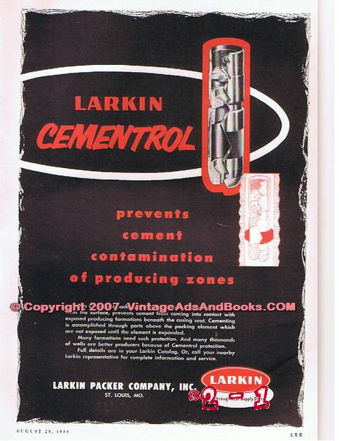 Original oil and gas trade magazine vintage ad for LARKIN PACKER COMPANY, INC. of St. Louis, MO. Prevents cement contamination of producing zones. Cementrol. Unique 1955 old oilfield petroleum well equipment magazine advertisement would display beautifully matted and framed. Nice graphics.