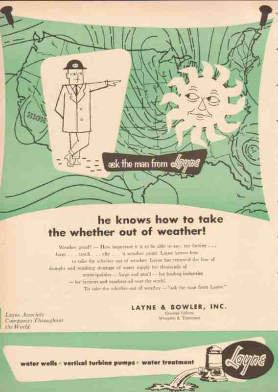 Original oil and gas trade magazine vintage ad for THE LAYNE & BOWLER, INC of Memphis, TN. Ask the man from Layne , he knows how to take the whether out of weather!. Removed the fear of drought and resulting shortage of water supply for thousands of municipalities, industries, and farmers and ranchers all over the world. This unique 1955 old oilfield petroleum drilling equipment magazine advertisement would display beautifully matted and framed. Nice graphics.