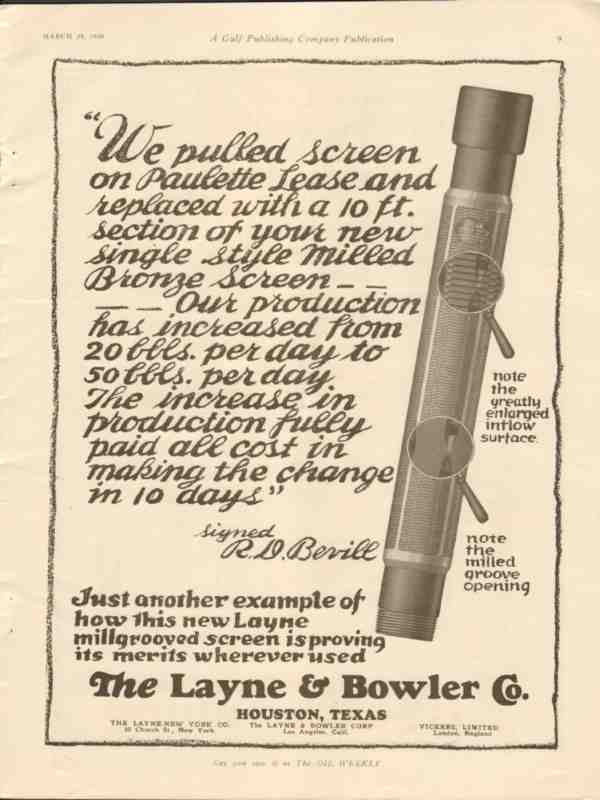 Original oil and gas trade magazine vintage ad for THE LAYNE & BOWLER COMPANY of Houston, TX.  We Pulled Screen on Paulette Lease and Replaced with a Section of Single Style Milled bronze Screen and Production Increased from 20 to 50 bbls per day. R. D. Bevill. Unique 1928 old oilfield petroleum industry tools and equipment magazine advertisement. Nice graphics.