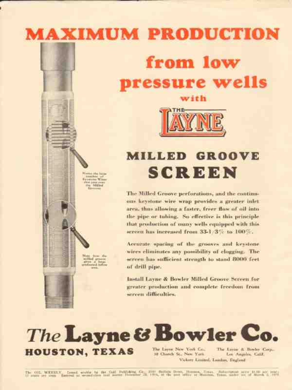 Original oil and gas trade magazine vintage ad for THE LAYNE & BOWLER COMPANY of Houston, TX.  Maximum Production for Low Pressure Wells with The Layne Milled Groove Screen. Allows a faster, freer flow of oil into the pipe or tubing. This unique 1931 old oilfield petroleum industry equipment magazine advertisement would display beautifully matted and framed. Nice graphics.