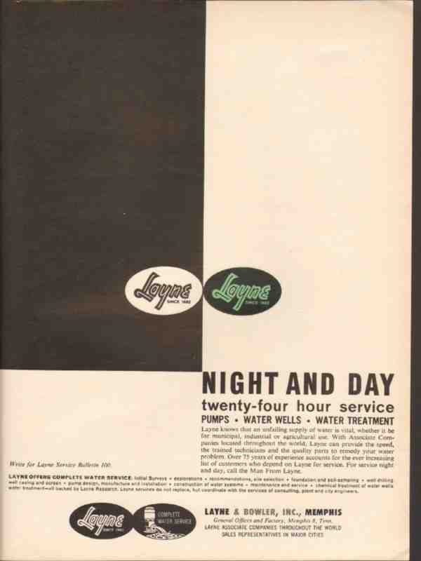 Original oil and gas trade magazine vintage ad for THE LAYNE & BOWLER, INC of Memphis, TN.  Night and Day Twenty Four Hour Service for Pumps, Water Wells, Water Treatment. This unique 1962 old oilfield petroleum tools and equipment magazine advertisement would display beautifully matted and framed. Nice graphics.