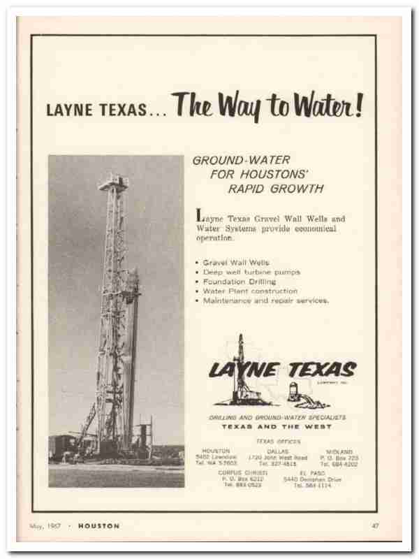 Original 1967 Houston business trade magazine vintage ad for LAYNE TEXAS COMPANY, INC. Offices were located at 5402 Lawndale, Houston, TX, 1720 John West Road, Dallas TX, 5440 Doniphan Drive, El Paso, TX. Offices were also located in Midland and Corpus Christi, Texas. Layne Texas, The Way to Water! Ground-water doe Houstons Rapid Growth. Gravel Wall Wells and Water Systems provide economical operation. This old dated one page construction magazine advertisement would display beautifully matted and framed.