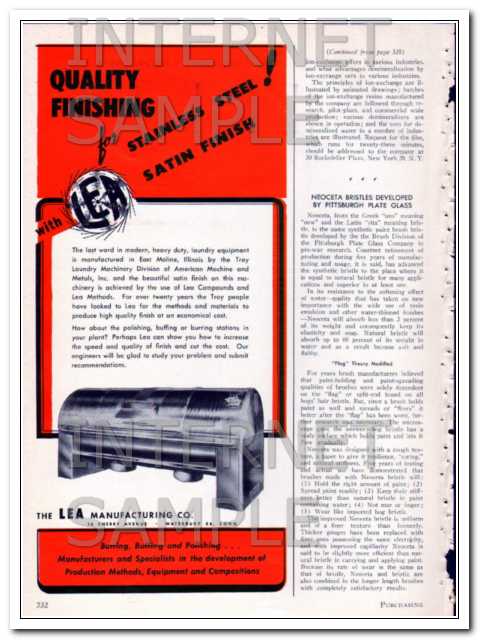Original vintage magazine ad for THE LEA MANUFACTURING COMPANY of 16 Cherry Ave, Waterbury CT. Quality Finishing for stainless steel with LEA Satin Finish. Picture shown is of heavy duty laundry equipment made by the Troy Laundry Division of American Machine and Metals, Inc., of East Moline, IL. Old 1948 industrial advertisement