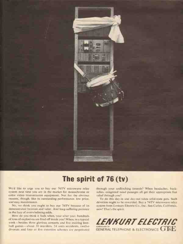 Original vintage broadcasting trade magazine ad for LENKURT ELECTRIC COMPANY of San Carlosk, CA. Subsidiary of General Telephone and Electronics, GTE. The Spirit of 76 TV. 76TV Microwave Relay System for Monochrome or Color Video Transmission Equipment. Old 1965 television and radio broadcasting advertisement.