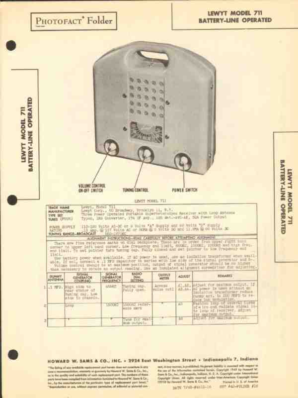 Vintage LEWYT model 711 3 power operated portable Superheterodyne AM radio receiver. Original old Sams Photofact manual includes schematics, layouts, alignment, adjustments, parts list. 4 pages. Dated 1948. Lewyt Corp. of Brooklyn, NY. This manual would make a sensational accompaniment to your vintage audio equipment.