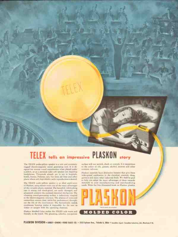 Original old plastics trade magazine ad for LIBBEY, OWENS, FORD GLASS COMPANY of Toledo, OH.  Telex Tells an Impressive Plaskon Story.  The Telex under pillow speaker is a rugged electro-magnetic sound generating unit.  Plaskon Molded Color makes this Telex unit warm and friendly to the touch.  This 1947 magazine advertisement would display beautifully matted and framed.