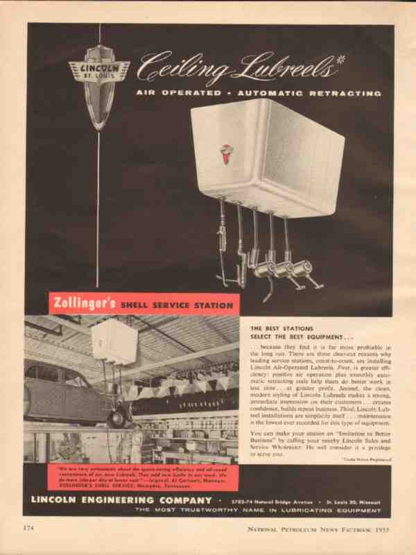 Original oil and gas service station industry trade magazine vintage ad for LINCOLN ENGINEERING COMPANY of St. Louis, MO. Zollinger's Shell Service Station, Al Carheart, Manager, located in Memphis,TN. Lincoln Air Operated, Automatic Retracting Ceiling Lubreels. Old 1955 gasoline service station equipment magazine advertisement.
