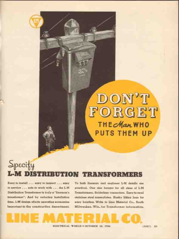 Original old electrical power industry trade magazine ad for LINE MATERIAL COMPANY of Milwaukee, WI.  Don't Forget the Man Who Puts Them UP.  Specify L-M Distribution Transformers. This 1936 industry magazine advertisement would display beautifully matted and framed.