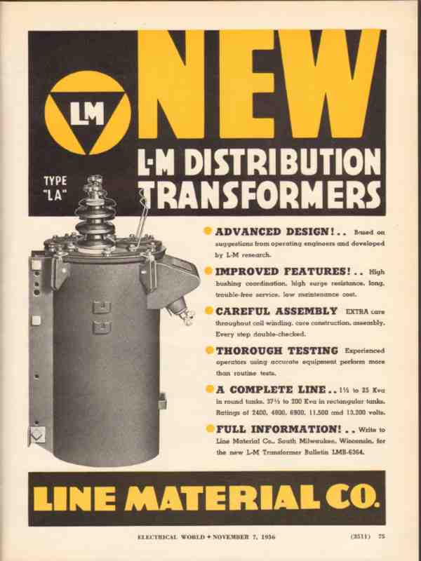Original old electrical power distribution industry trade magazine ad for LINE MATERIAL COMPANY of Milwaukee, WI.  New Type LA L-M Distribution Transformers. Advanced design, improved features. This 1936 industry magazine advertisement would display beautifully matted and framed.