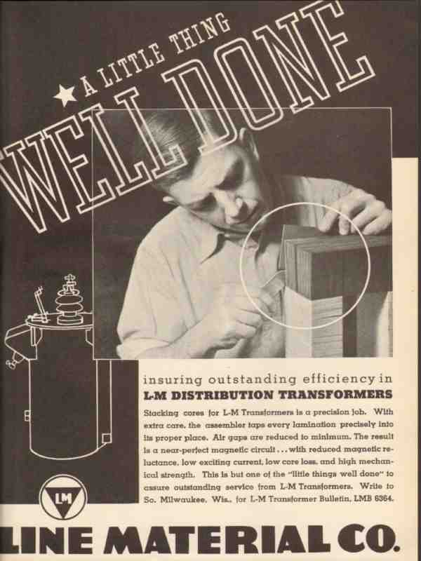 Original old electrical power industry trade magazine ad for LINE MATERIAL COMPANY of South Milwaukee, WI.  A Little Thing Well Done Insuring Outstanding Efficiency in L-M Electric Distribution Transformers. This 1936 industry magazine advertisement would display beautifully matted and framed.