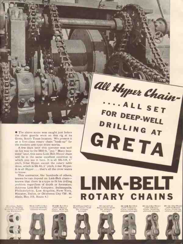 Original oil and gas trade magazine vintage ad for LINK-BELT COMPANY of Indianapolis, IN.  Hyper Chain All Set for Deep Well Drilling at Greta, South Texas. Rotary Chains for drilling, servicing and pumping. This unique 1936 old oilfield petroleum drilling industry equipment magazine advertisement would display beautifully matted and framed. Nice graphics.