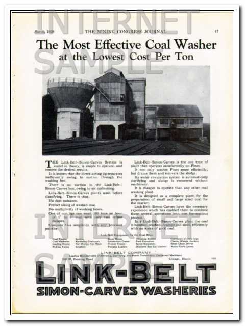 Original vintage mining magazine ad for LINK-BELT COMPANY of Chicago, IL. The Swing to Better Preparation Is On. The JAX Face Conveyor is shown. The Most Effective Coal Washer at the Lowest Cost Per Ton. Link-Belt--Simon-Carves plant. Shown is a washery for Doncaster Collieries Association Ltd., England, a washery for Southe Kirby, Featherston and Hemsworth Collieries Ltd, a washery for Barber Walker and Company in England. Old eight-page 1928 coal mining equipment industry advertisement. Would display beautifully matted and framed!