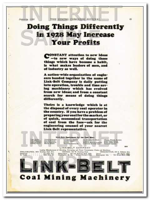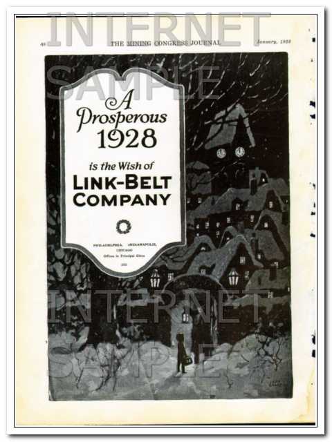 Original vintage mining magazine ad for LINK-BELT COMPANY of Philadelphia, PA. Doing Things Differently in 1928 May Increase Your Profits. A Prosperous 1928 is the Wish of Link-Belt Company. 1st page of the ad is artist signed by Jeff Grant. Old 1928 coal mining equipment industry advertisement. Would display beautifully matted and framed! 4 pages. approximate 9 x 12 inches.